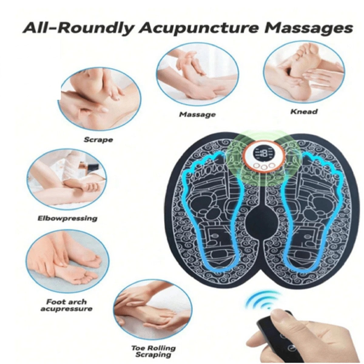 Este revolucionario masajeador, estimula los músculos de los pies y las piernas mediante impulsos eléctricos de baja frecuencia, se dirige a los puntos gatillo y alivia la tensión en su origen